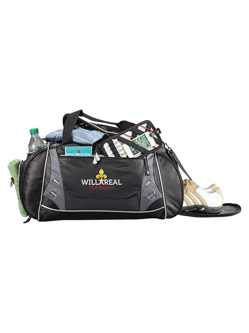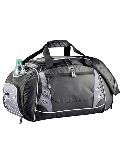 Zippered main compartment with U-shaped opening. Front zippered pocket with earbud port includes removable sport techtrap organizer. Large ventilated side pocket holds shoes or damp garments. Additional side zippered accessory pocket with exterior elastic shock cord for maximum storage. This sporty bag also includes an open insulated bottle pocket. Handles made of durable webbing with comfortable handle wrap; side grab handle. Detachable, adjustable shoulder strap features the Drive series unique ventilation patterned shoulder pad. Signature elleven™ lining and hardware. Free run charges for embroidery up to 7500 stitches.